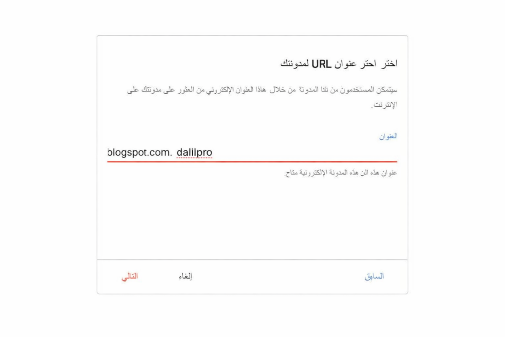 2. بمجرد الانتهاء، قم بالضغط على زر “التالي” (Next) الموجود في أسفل يسار المربع الظاهر في الصورة للانتقال لمرحلة تحديد رابط المدونة.