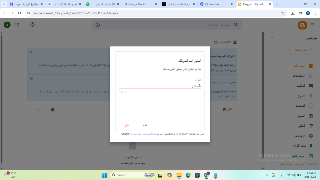 بمجرد الضغط على زر “إنهاء”، ستنتقل مباشرة إلى لوحة تحكم مدونتك الجديدة، لتصبح الآن صاحب موقع رسمي جاهز لنشر أولى مقالاتك وبدء رحلة الربح من بلوجر.