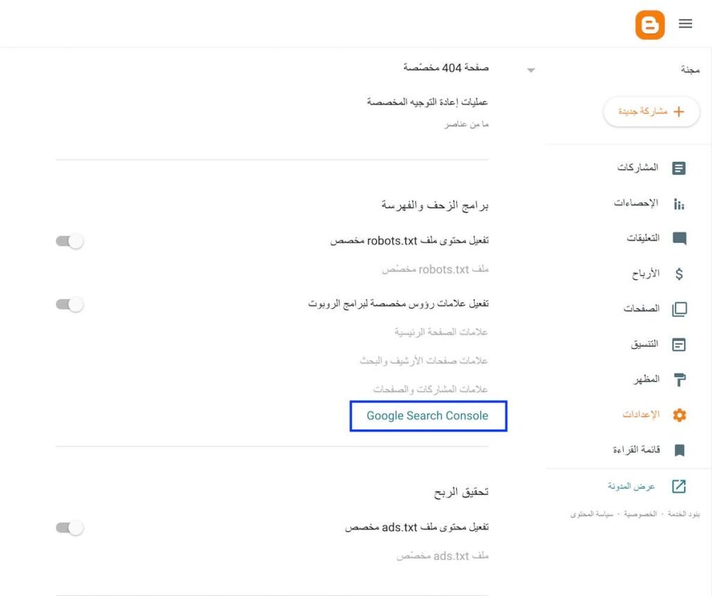 1. من قائمة “الإعدادات” في لوحة تحكم بلوجر، قم بالتمرير للأسفل حتى تصل إلى قسم “برامج الزحف والفهرسة”.