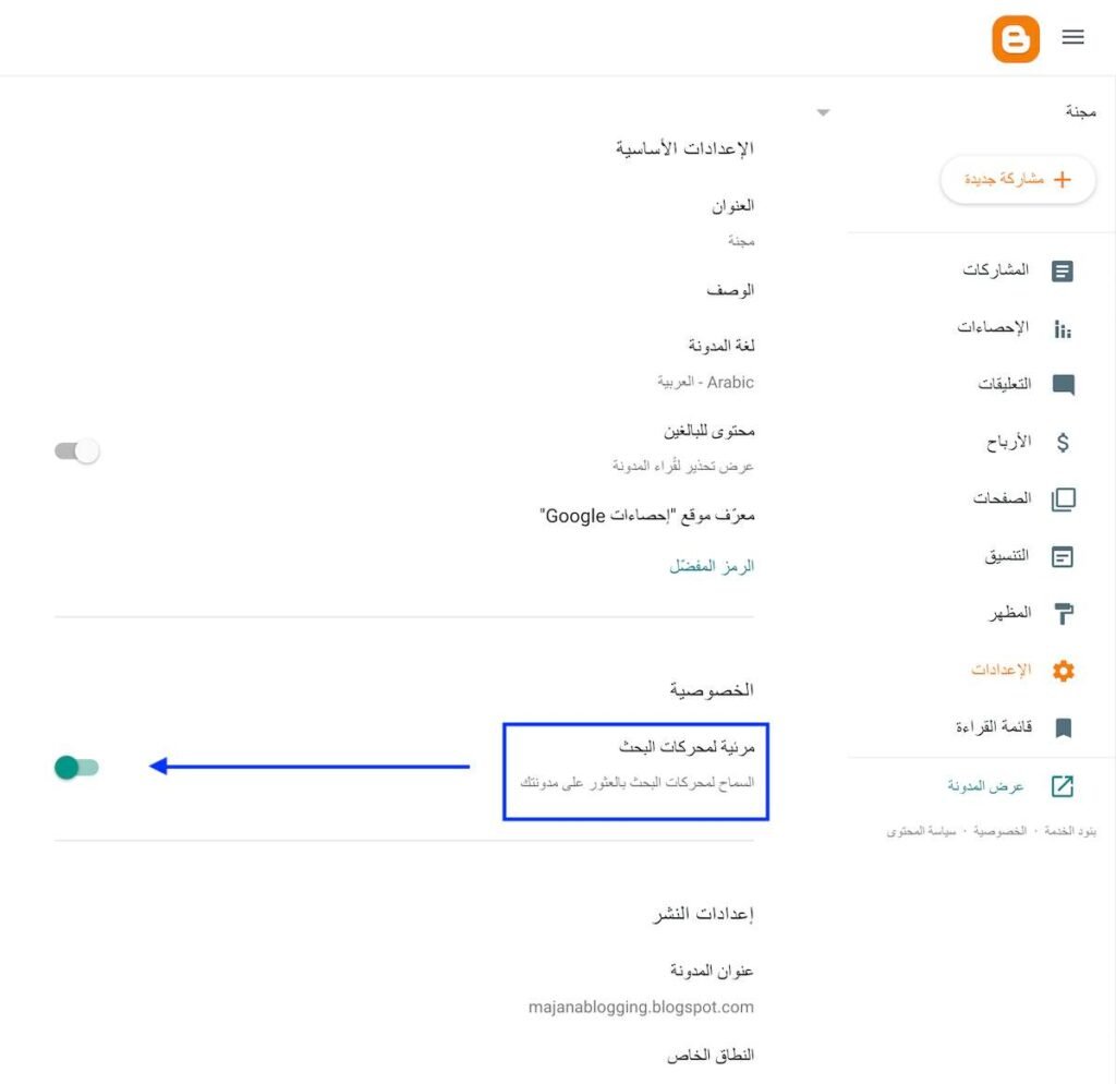3. تأكد من تفعيل خيار “مرئية لمحركات البحث” (السماح لمحركات البحث بالعثور على مدونتك) بحيث يظهر الزر باللون الأخضر كما هو موضح في الصورة.