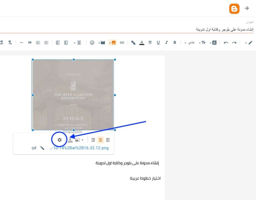 3. طريقة التفعيل: كما يظهر في الصورة أدناه، قم بتحديد الصورة داخل المقال، ثم اضغط على أيقونة الخصائص (الترس)، وقم بكتابة النص البديل ووصف العنوان الخاص بالصورة مستخدماً كلماتك المفتاحية بذكاء.