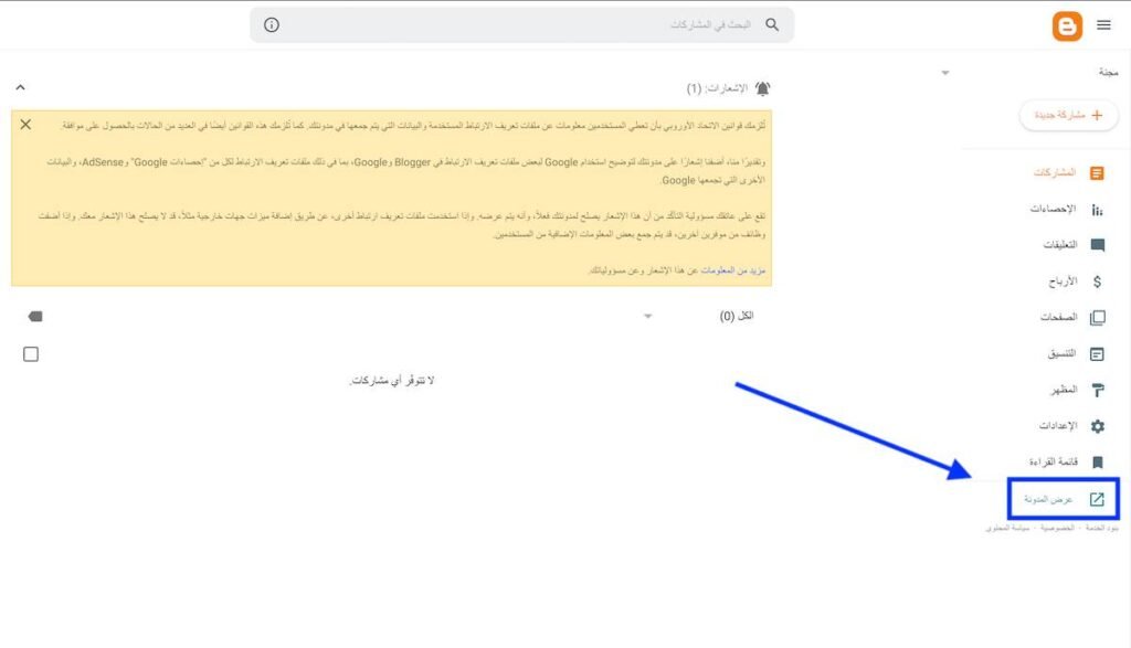 لمعاينتها ورؤية كيف تظهر للزوار، كل ما عليك فعله هو التوجه إلى لوحة التحكم الخاصة بك، ثم النزول بأسفل القائمة اليمنى والضغط على خيار “عرض المدونة” كما هو موضح في الصورة المرفقة.